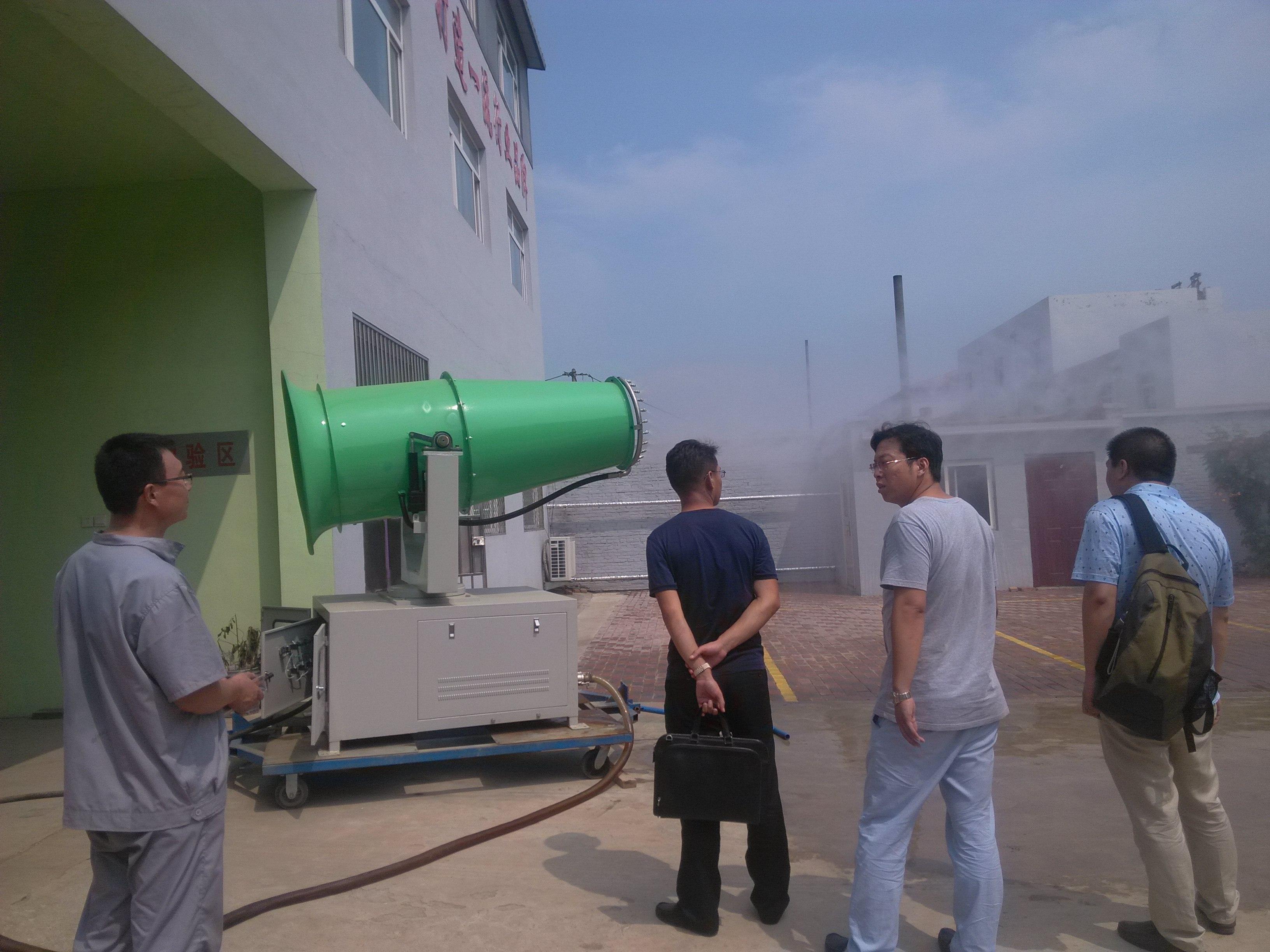 2015年8月6日江蘇錦昊機電有限公司客戶不遠萬里來我公司參觀除塵噴霧機,我公司也拿出我們的新型產品LHW-50型除塵噴霧機,該噴霧機采用鈦合金風葉,采用軍用戰機發動機扇葉一樣的材質,其耐高溫,韌性大,可以保證除塵噴霧機長時間運行,同時我公司這種除塵噴霧機采用了歐洲風機后錐翻邊技術,可以有效的降低噪音,提高風流量增加射程。