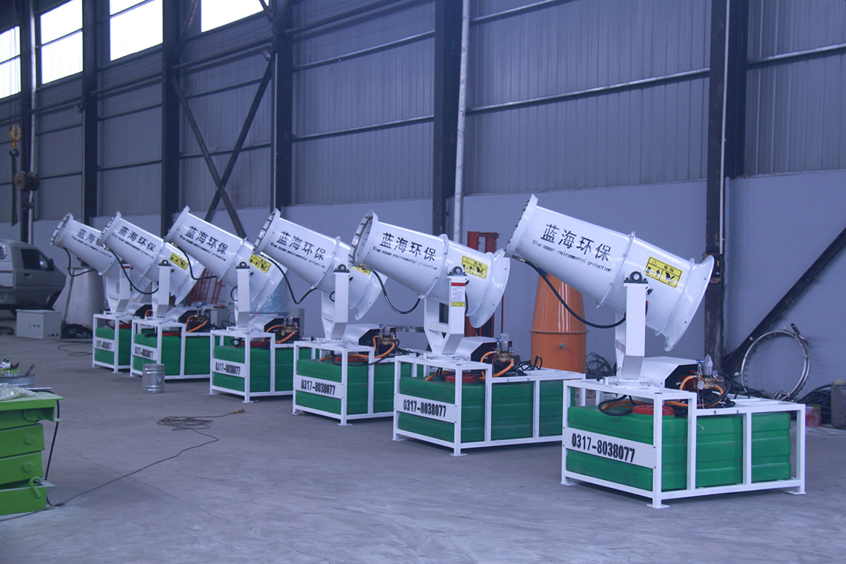 霧炮機(jī)應(yīng)該是用高壓安裝將水霧化工作,使水霧和粉塵顆粒相同大小的水分子,然后應(yīng)用大功率風(fēng)機(jī)送風(fēng),噴霧器具有強(qiáng)風(fēng),范圍廣,防塵空氣與水霧顆粒接觸凝結(jié)沉淀,然后到達(dá)防止灰塵,凈化空氣。