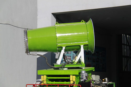 霧炮機是采用高壓水泵供水,通過水管將水送入噴霧機的噴頭處,由水泵產生的壓力在通過特制的噴頭將水產生顆粒較大的霧狀;然后由高速運轉的電動機帶動風扇,產生高速流動的氣流,將水霧送出去。將顆粒較大的水霧通過高速的氣流,進一步撕裂成更細小更輕的水霧,并輸送出去。