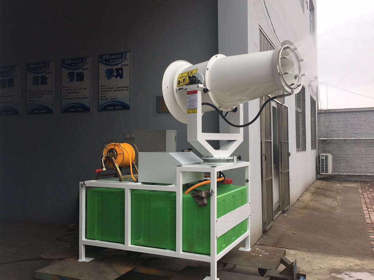 風送式霧炮機由、風機、液壓泵、動力配置、風葉、噴嘴、支架、俯仰液壓系統等。