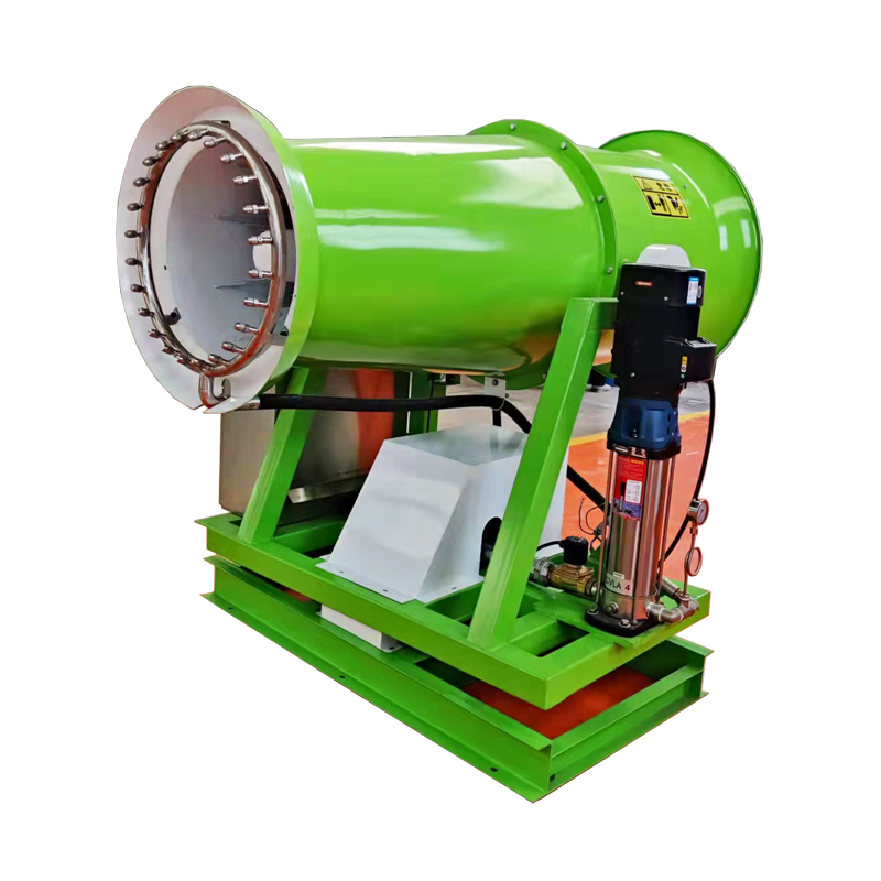 霧炮機的原理不難,利用壓力將水加壓成霧,再將霧噴射出風機,霧與粉塵結合、吸附,加速粉塵降落,從而達到降塵的效果。